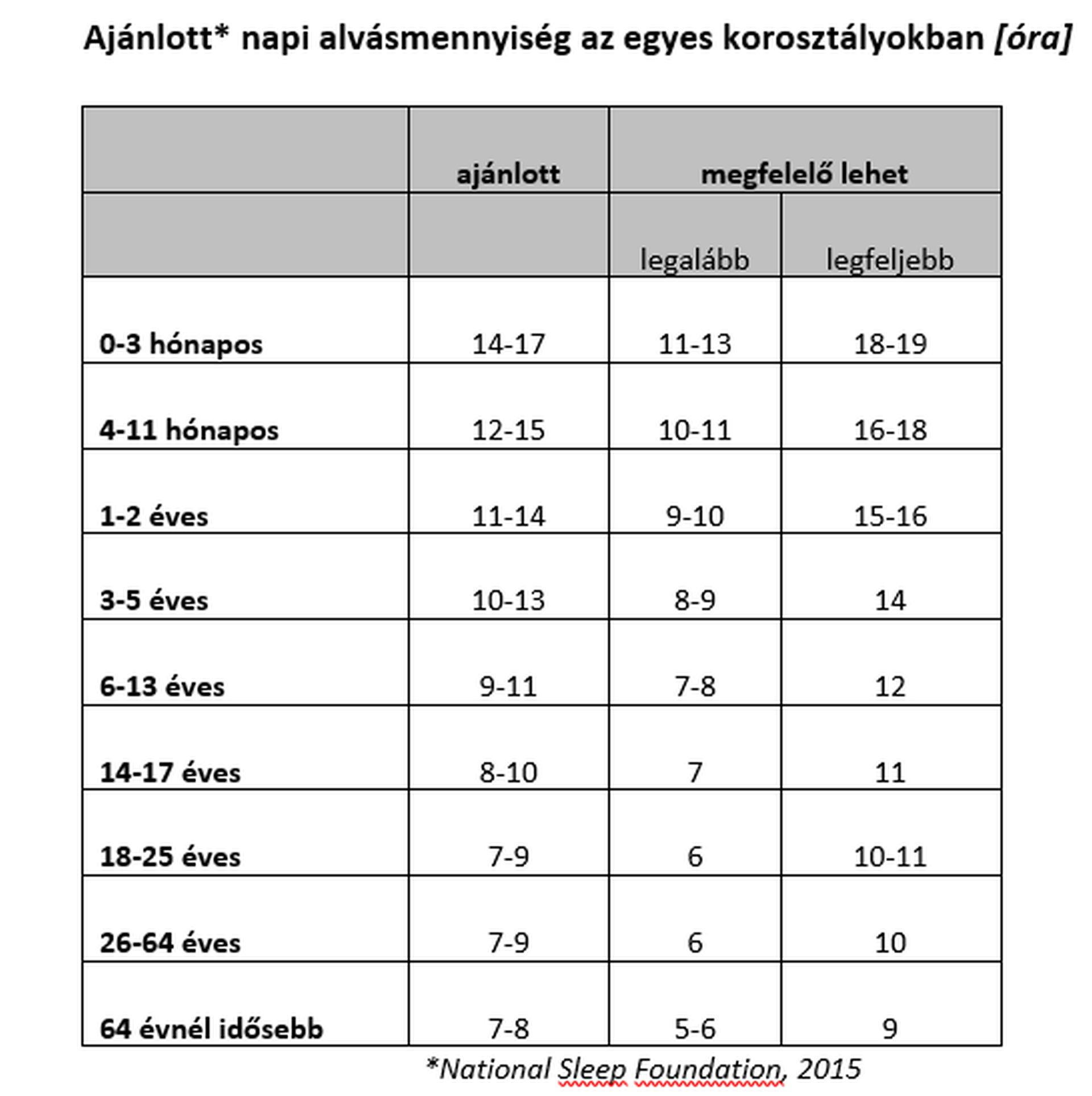 Az egészség megőrzéséhez szükséges alvás mennyisége életkoronként és személyenként is változó. Így az USA Nemzeti Alvás Alapítványának legfrissebb ajánlása is csak tól-ig értékeket használ.