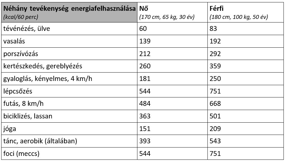 Ennyi tudománnyal már az is könnyen kiszámolható, hogy például 1 óra alatt megközelítően mennyi energiát lehet felhasználni valamely tevékenységgel. Így például a tévé előtti békés ücsörgéssel 60 perc alatt Franciska 60 kilokalóriát, míg Ferenc 83-at fogyaszt. Ám ha inkább futni mennek és bírják a közepes tempót, akkor 484, illetve 668 kcal/órával "égethetik a zsírt".
