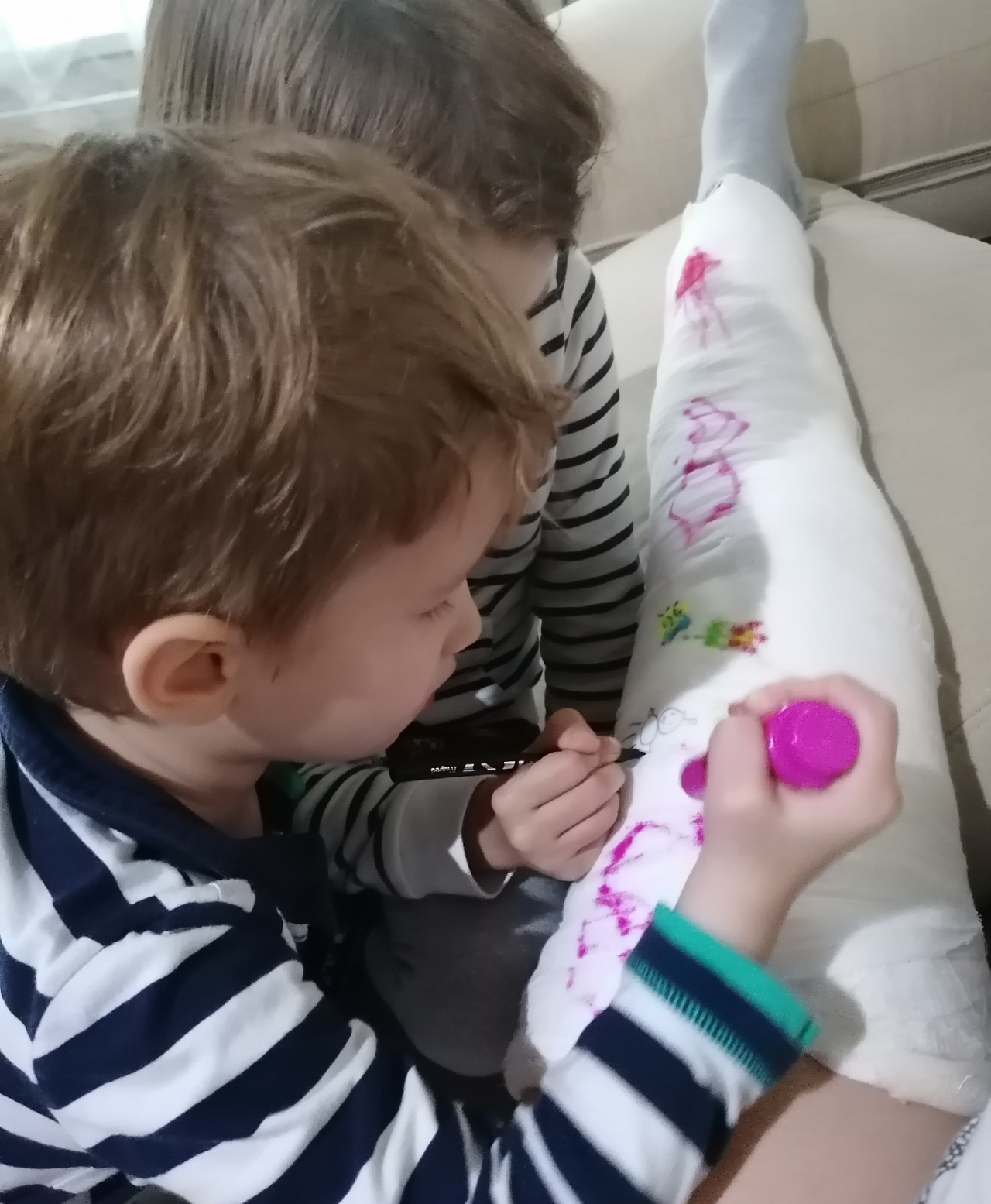 A történtek nyomot hagytak a kicsik lelkében, minden nap el kellett mondanom, hogy anyának nincs nagy baja, csak a lábamnak sokat kell pihennie, hogy újra szaladgálhassak velük. Érthető módon főleg a kisfiamon érződött még sokáig a nyugtalanság. Rémálmai voltak, újra bepisilt, előjött a szeparációs szorongása. A tényről, hogy ő okozta a balesetet, azzal próbáltam elterelni a figyelmét, hogy kineveztem az én kis hősömnek, hiszen nélküle nem tudtam volna segítséget hívni. Onnantól kezdve jó pár hétig nem tűrt meg a közelemben senkit, legfőképp a nővérét nem, aki viszont szintén nagyon aggódott értem, és igényelte a társaságomat. Ekkor láttam meg a baleset egyik legnagyobb pozitívumát: mivel fekvő helyzetben sok mindent nem lehet játszani a gyerekekkel, soha ennyi mesét, verset nem olvastam nekik egyszerre, és rengeteget társasoztunk hétköznapokon is, nem csak hétvégeken. Azt hiszem, a sok-sok együtt töltött, összebújós délutánnak – amit ezúttal soha nem szakított meg valamilyen rendkívül fontos tennivaló – köszönhetem azt, hogy egy-két hét alatt beálltak a gyerkőcök az új rendszerre, és láthatóan nyugodtabbá váltak.