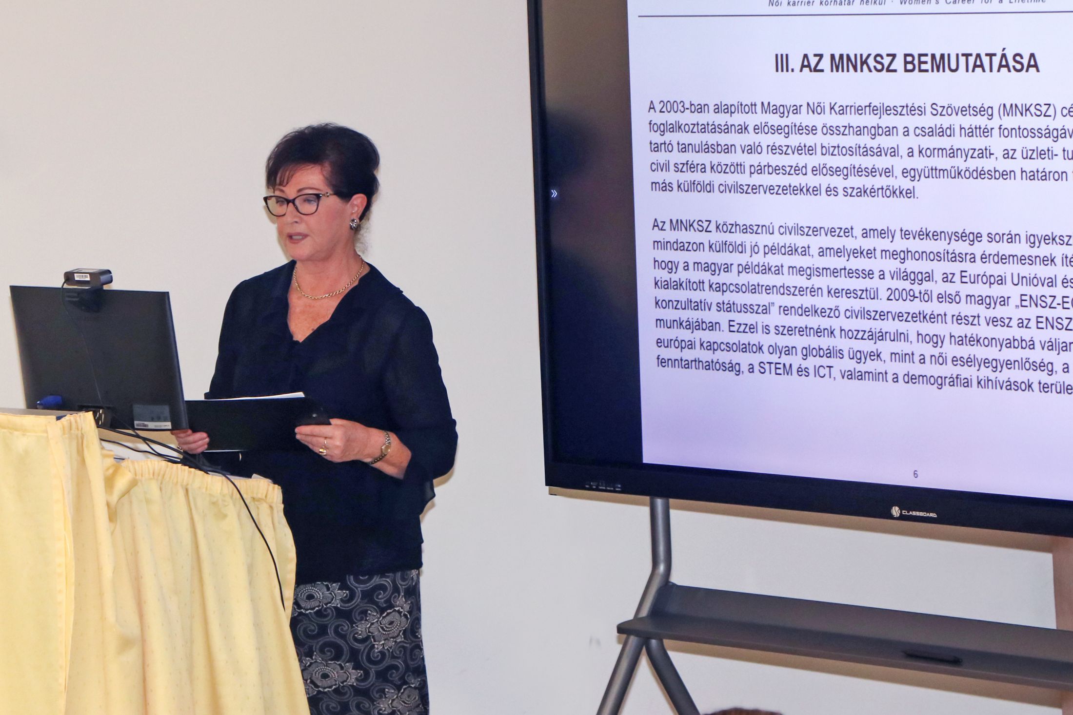 Előadásában kitért arra, hogy a világon és Magyarországon is a leggyorsabban növekvő korcsoportot alkotják az idősödő nők, akik sokszor többszörösen hátrányos helyzetűek, ezért szükségük van arra, hogy az érdekképviseletüket valaki biztosítsa. Erre vállalkozott a Magyar Női Karrierfejlesztési Szövetség.